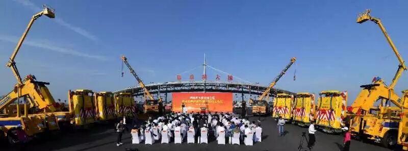 2018年4月10日下午,港珠澳大桥收费广场上春光明媚,洋溢着喜悦的气氛。随着港珠澳大桥管理局朱永灵局长从中铁物资集团王辉总经理手中接过象征交车的钥匙牌,港珠澳大桥主体工程首批45辆拯救及养护设备正式交付使用。